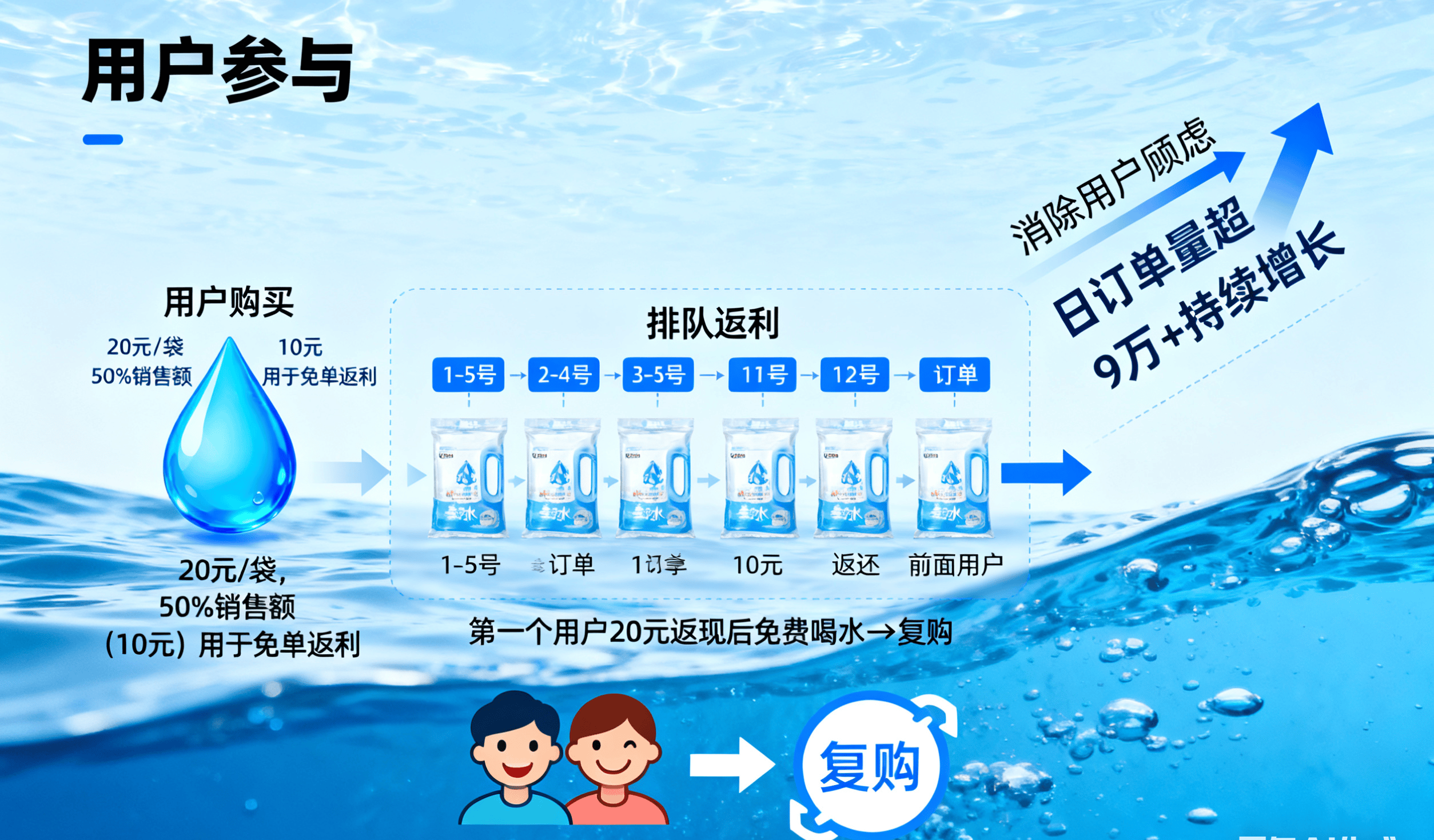 用户购买该水,不仅因其健康属性,还因能参与平台的全网排队免单活动。每售出一袋水,平台会拿出 50%的销售额用于免单返利,如 20 元的水拿出 10 元。以 1 - 5 号订单为例,每袋水拿出的 10 元会依次返还给前面的用户,第一个用户 20 元返现后相当于免费喝水,且大概率会复购。随着订单持续增加,后续用户也能依次享受免单。目前平台每日订单量超 9 万且持续增长,用户无需担忧后续无人购买。