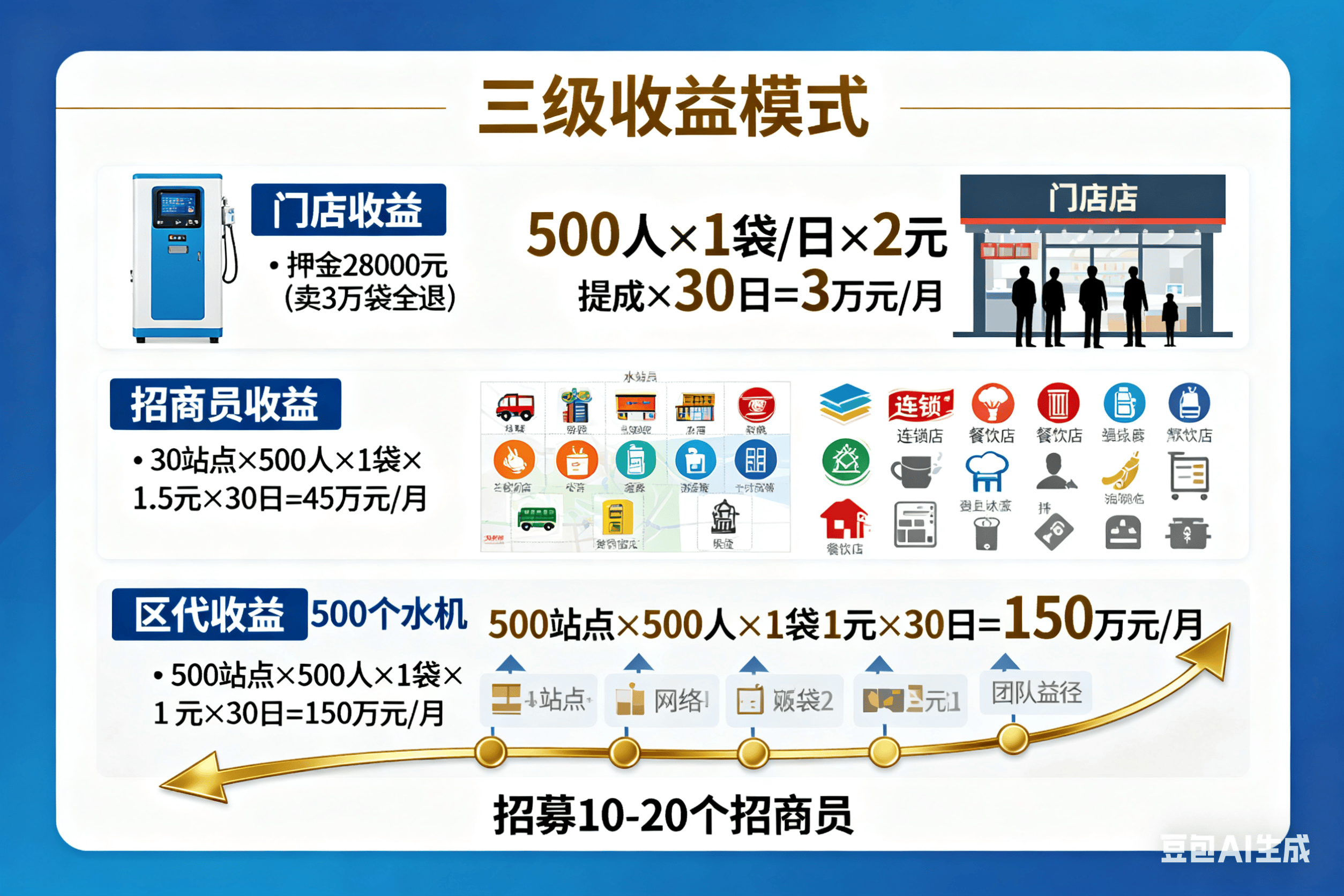 负责招门店入驻的招商员同样有收益。若一个月或两个月内发展到 30 个水站点(水机),投放到连锁店、餐饮店、美业店、便利店或菜鸟驿站等,每个站点服务周边 500 人,按每人每日买一袋水计算,招商员月收益可达 45 万元。