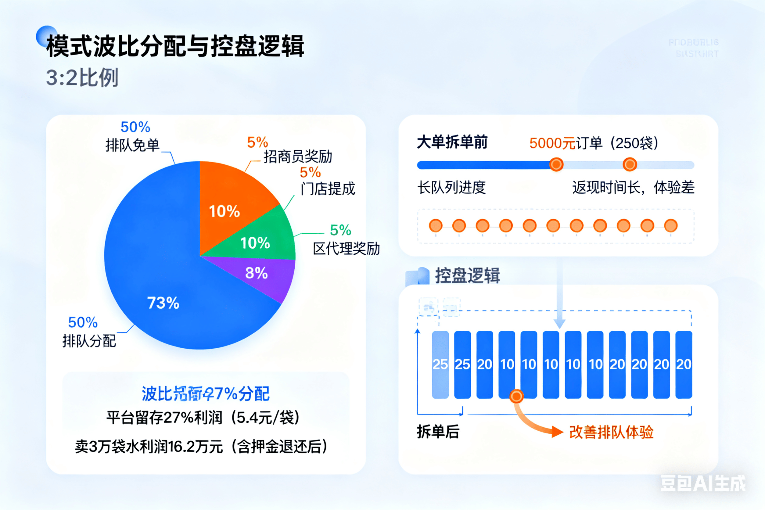 该模式还有一些控盘逻辑。针对大单拆单问题,如客户购买 5000 元 250 袋水或团购订单,若按整单返现,返现时间长,用户体验差。采用大单拆单后,5000 元订单拆成 25 个 20 元的单,虽对客户本质无影响,但能改善后续用户的排队体验。