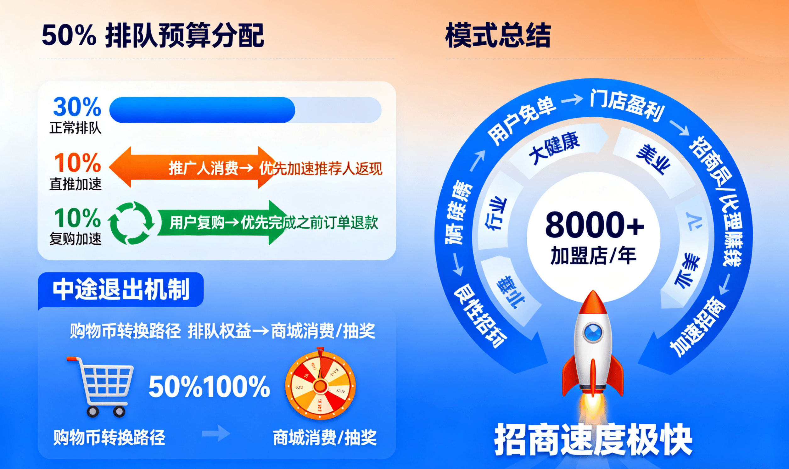 此外,还设置了直推加速和复购加速。将 50%的排队预算分为三部分:30%用于正常排队,10%用于直推加速(推广人消费时,优先加速推荐人订单返现),10%用于复购加速(用户复购时,优先完成之前订单退款)。同时,考虑到中途退出情况,用户可将排队权益转为 50% - 100%的购物币,用于商城消费或抽奖,吸引用户消费购物币或变现排队号,使排队序列更健康。
