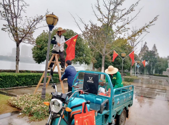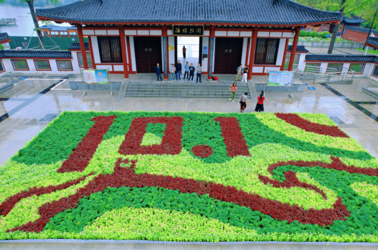 此次鲜花展以“欢度国庆”为主题,共计使用孔雀草、夏堇、五色梅及鸡冠花等时令花卉数十万株。各色花卉通过艺术搭配,在中心广场、主要街道及公园入口处形成层次分明、色彩绚丽的景观效果。其中,陆羽故园入口处的“10.1 千年龙脊·盛世中国”主题景观尤为引人注目。该造型以红色鸡冠花为主材,生动模拟出绵延长城与千年龙脊的雄伟轮廓,寓意国家繁荣昌盛,两旁配以精巧花境,更显生机盎然。园内园林工人们正有序悬挂五星红旗,吸引不少市民驻足观赏、拍照留念。